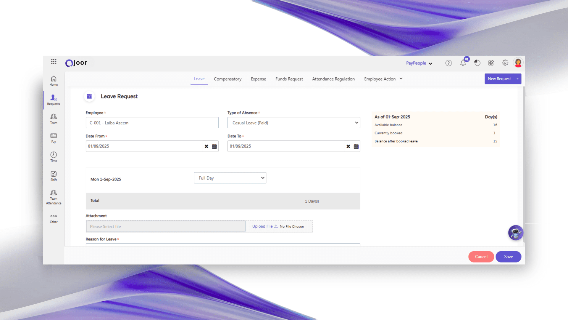 Submit leave, work-from-home, or time-off requests via the PayPeople HR Software in Pakistan’s mobile app.