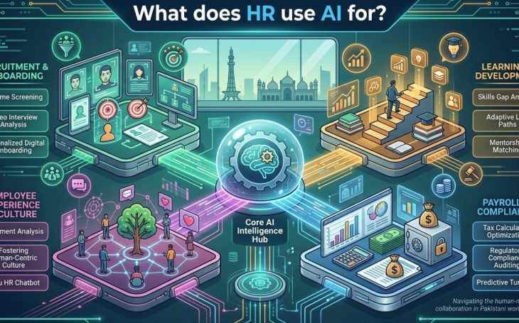 HR uses AI to automate repetitive tasks, improve hiring decisions, analyze employee data, and enhance overall productivity. In Pakistan, companies are combining AI with HR Software in Pakistan to streamline recruitment, payroll, attendance, and performance management efficiently.