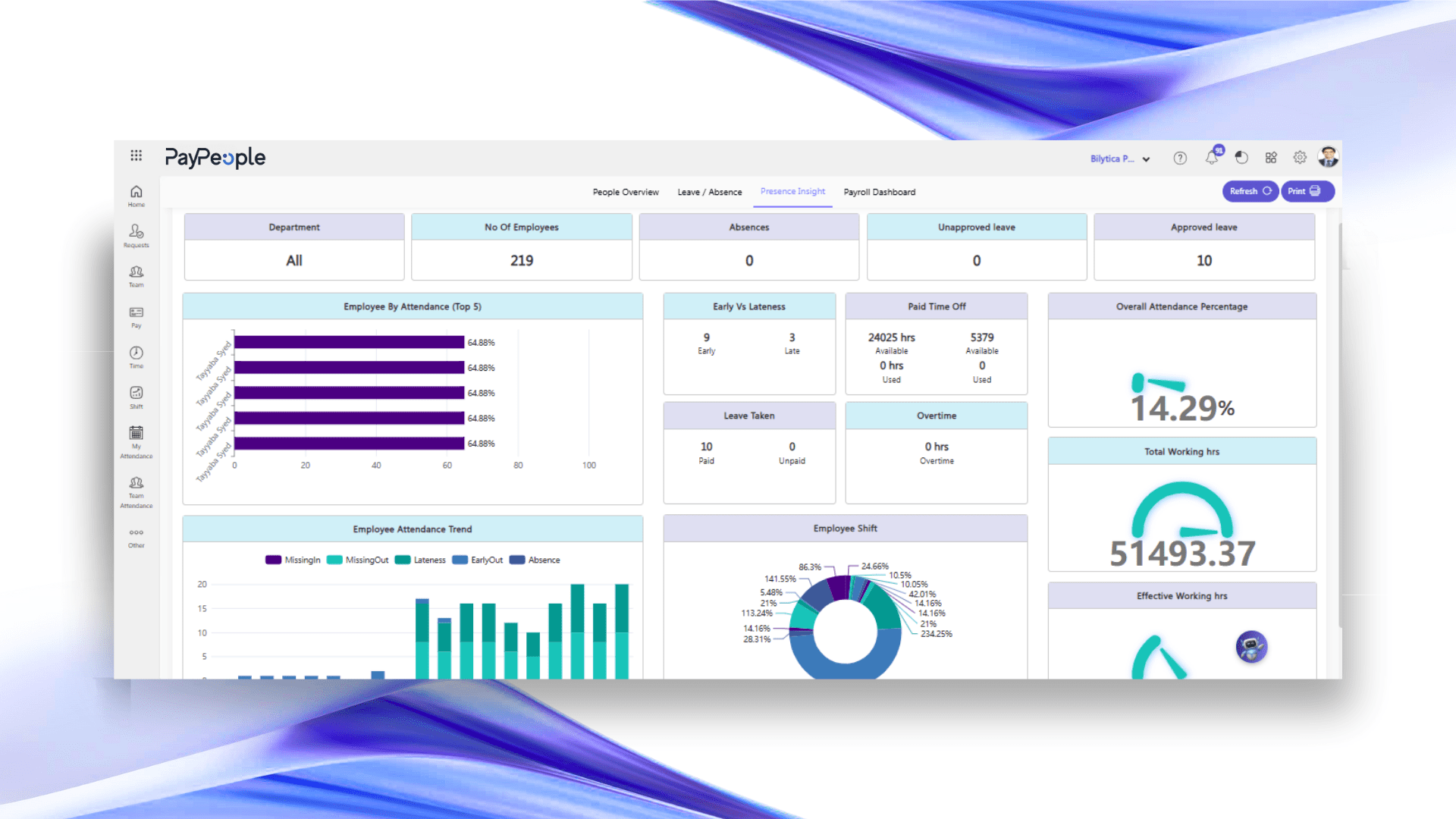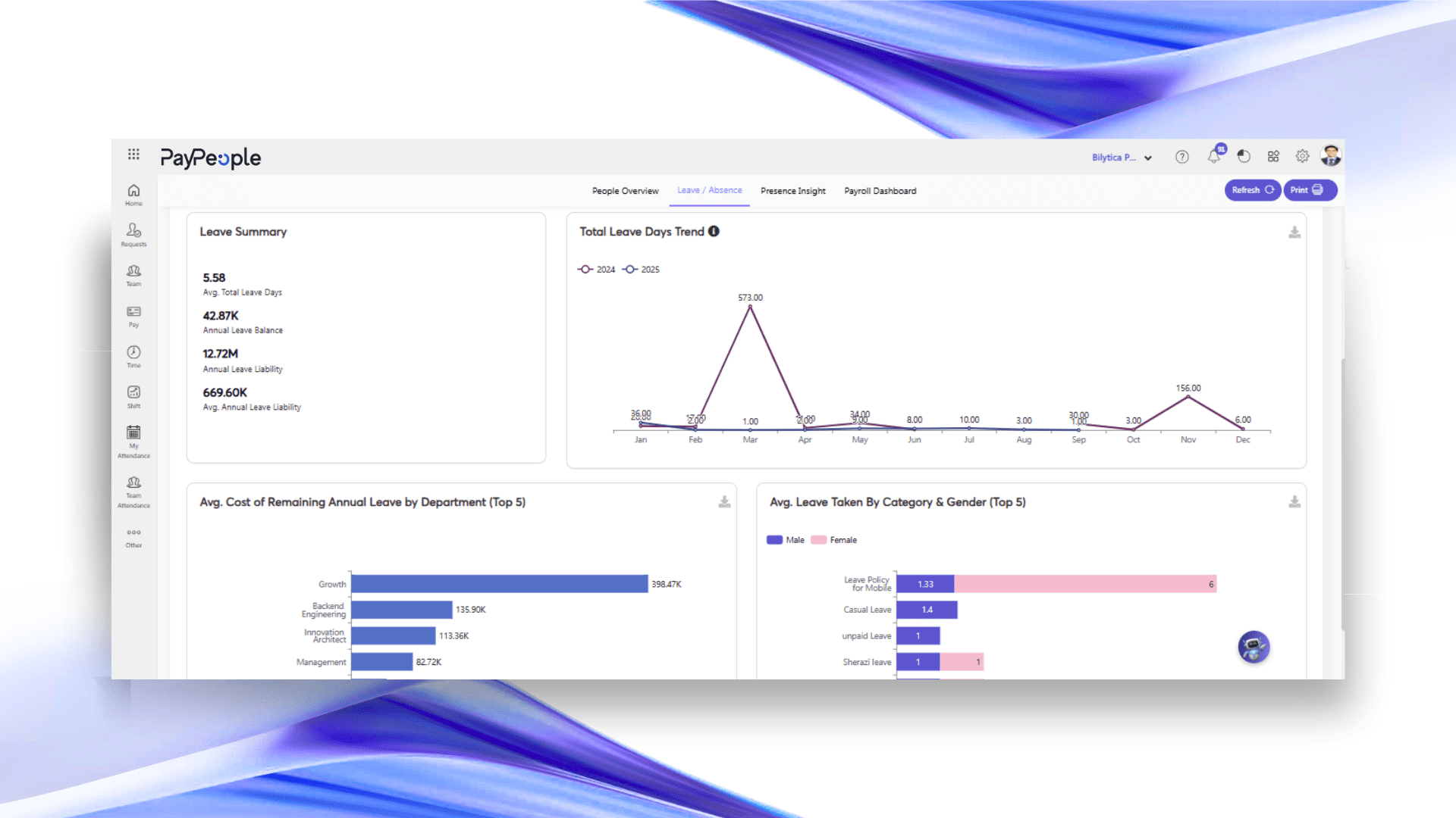 PayPeople HR Analytics Software in Pakistan streamlines leave tracking with powerful analytics and real-time insights. Detect absence patterns, manage approvals, and plan resources more effectively. Employees benefit from a transparent process, while managers gain complete visibility. Make smarter decisions that balance productivity with employee well-being.