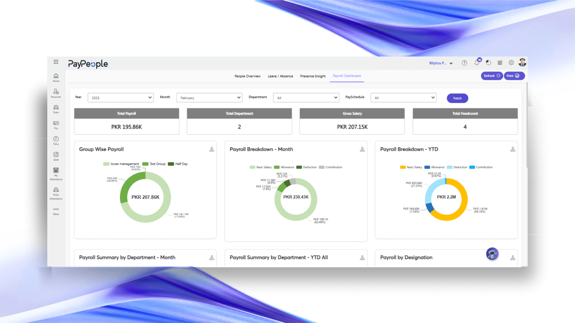 Experience interactive HR dashboards that simplify complex data into easy-to-understand visuals. PayPeople Payroll Software in Pakistan enables HR leaders to monitor KPIs in real time—covering everything from payroll trends to department productivity. Turn raw data into clear, actionable insights instantly.